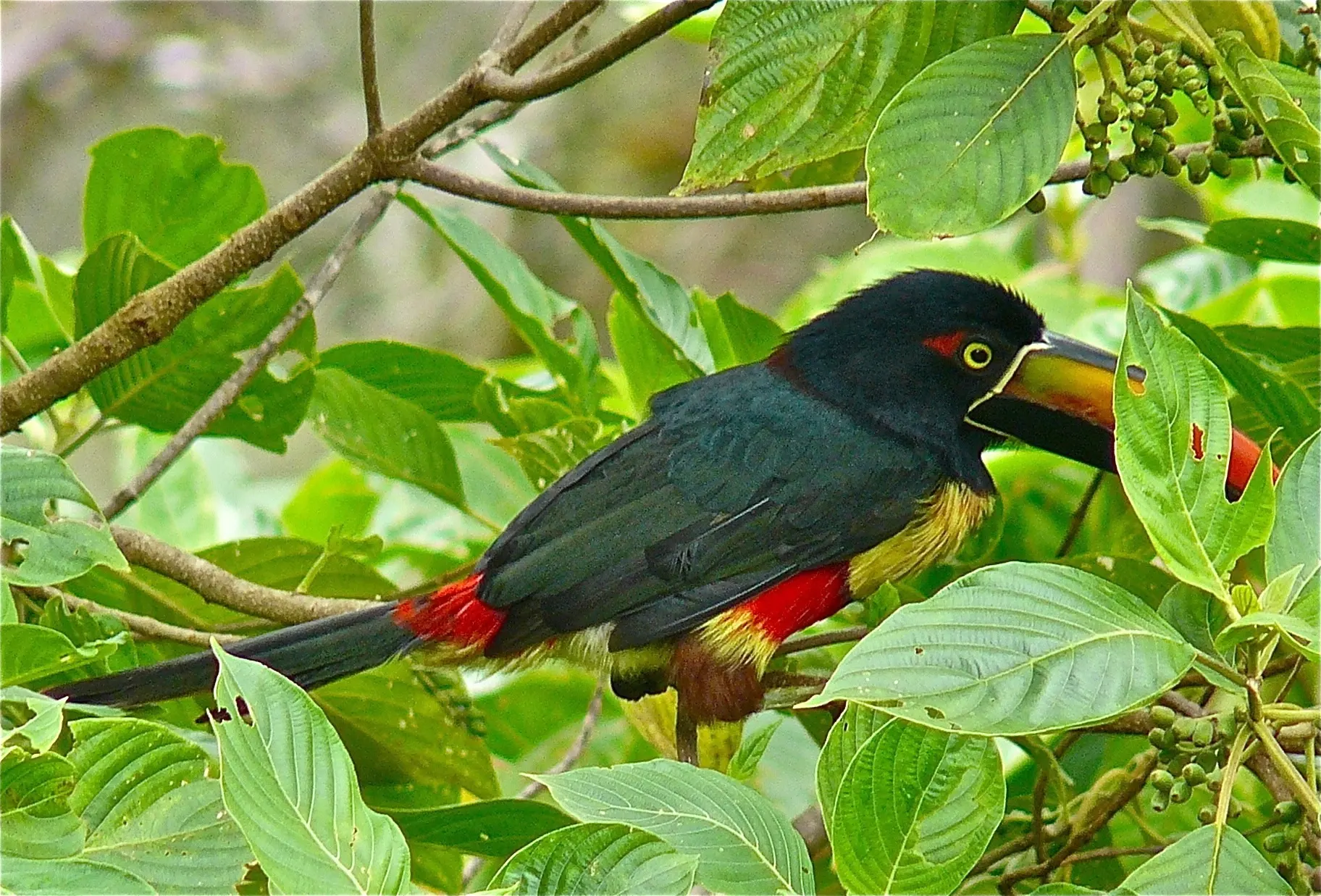 Here we have the tiniest hummingbirds of just a few grams to the huge crested Guan some 3 feet (90 cm) long, brilliant red Tanagers, electric-blue Dacnis, Emerald Toucanets, flocks of bright yellow and green Sulphur-winged Parakeets, Fiery-billed Aracaris (shown here), and the Resplendent Quetzal, thought by many to be the most beautiful bird in the world.