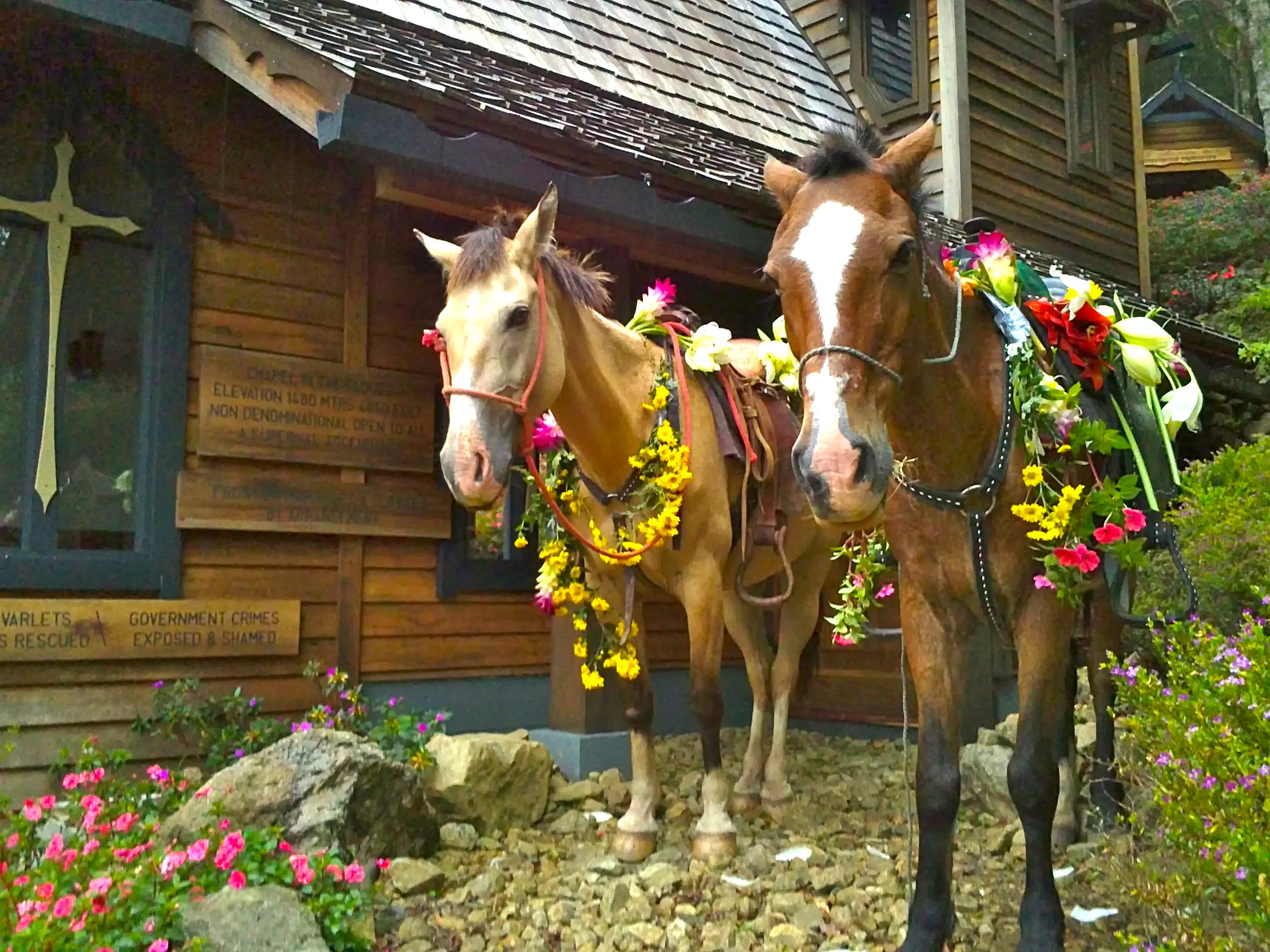 Two of my horses adorned with wildflowers from the gardens for a wedding and ride into Neverland.