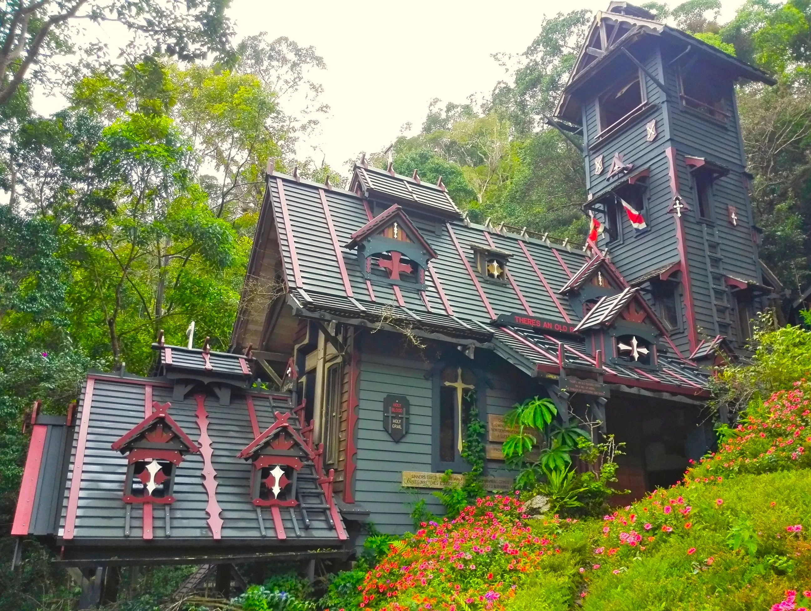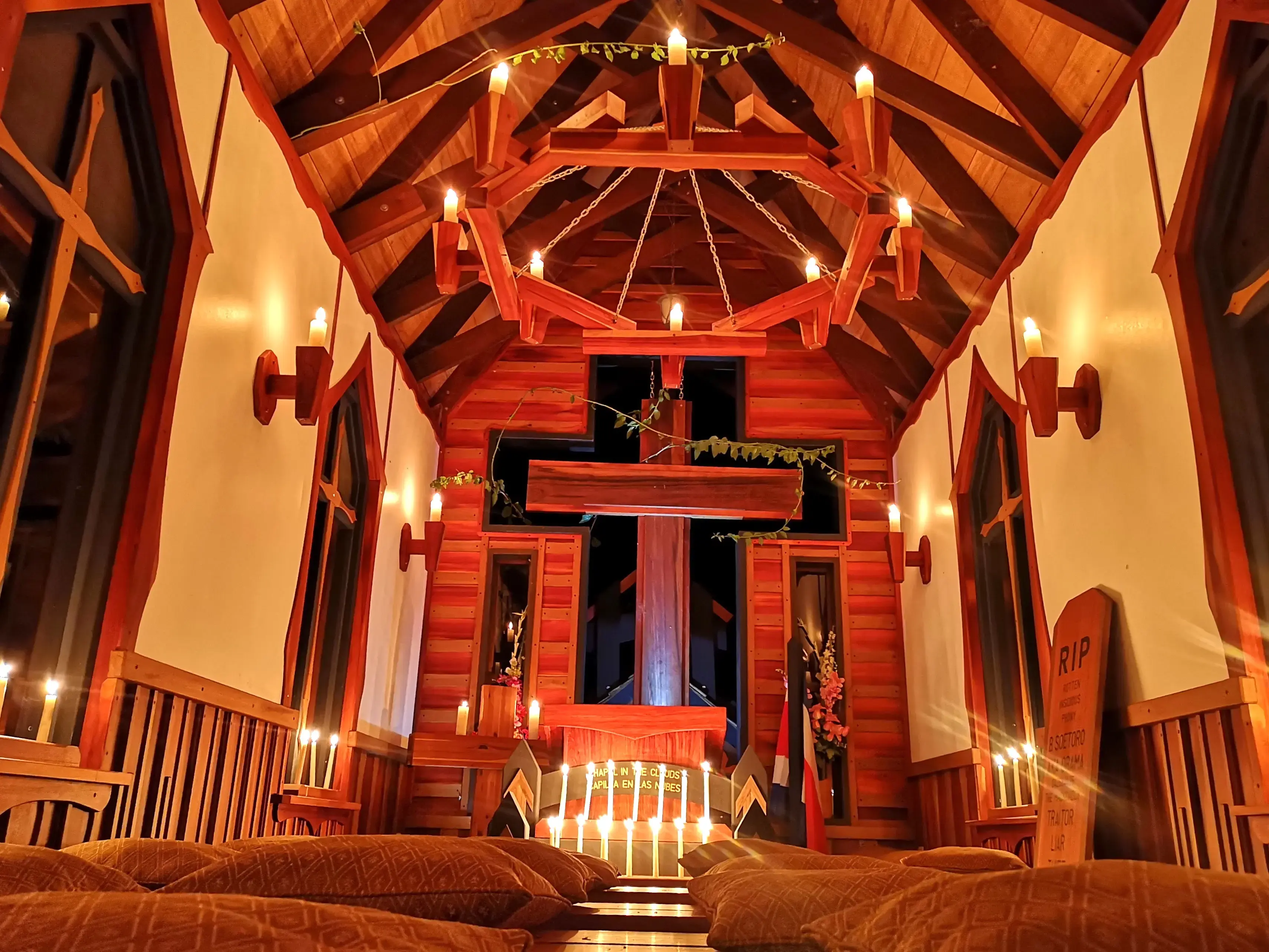 Nestled in the jungle, a peaceful chapel by day becomes a different entity by night.