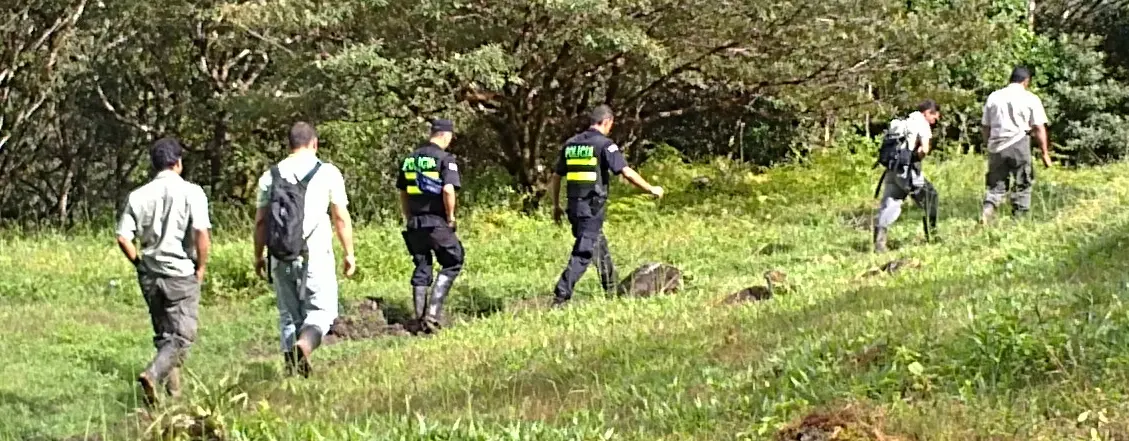 (Picture shows government officials protected by police on yet another sortie here. Sometimes they enter secretly, and at night through the jungle to spy on me.)